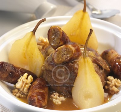 - تقدم أفخاذ العجل مسقية بالصلصة ومزينة بالإجاص المعسل، التمر المحشو والجوز.